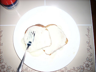 It's yet another idea I got from my online friend, HB. It basically consists of milk toast with chopped, boiled eggs in it. Very good. I really enjoy it and have it for breakfast pretty often (and sometimes for lunch).